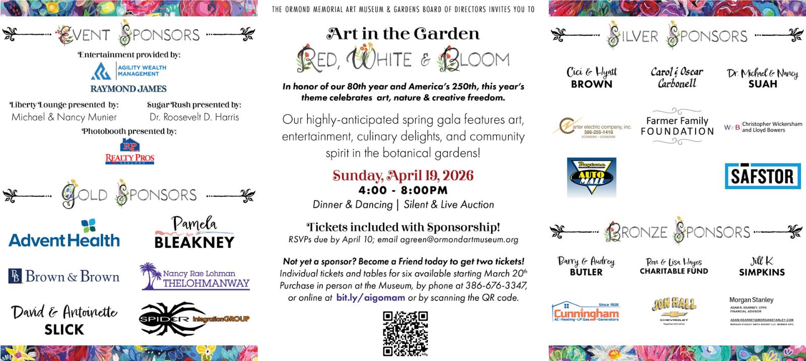 You can secure seats now by becoming a friend or by placing a sponsor commitment with Stephanie at smt@ormondartmuseum.org. All payments must be received by March 6th for inclusion in the printed invitation.