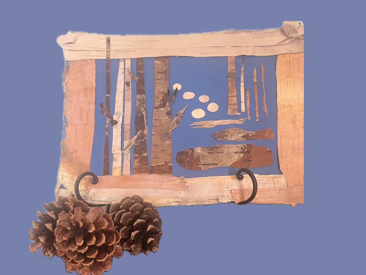 Create a 3D winter mixed media piece with Birch Tree Bark, textiles and white stone on board. All supplies will be provided, and no art experience is needed.